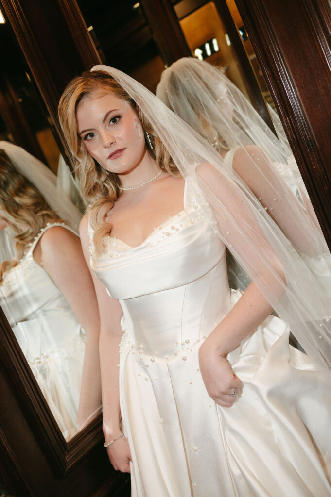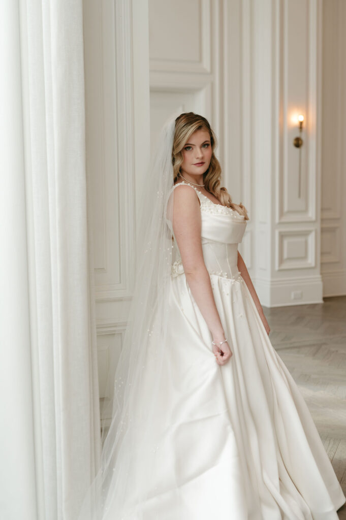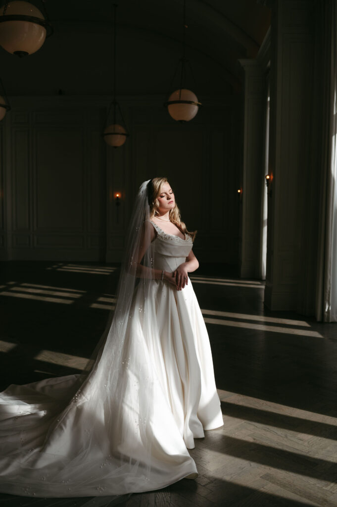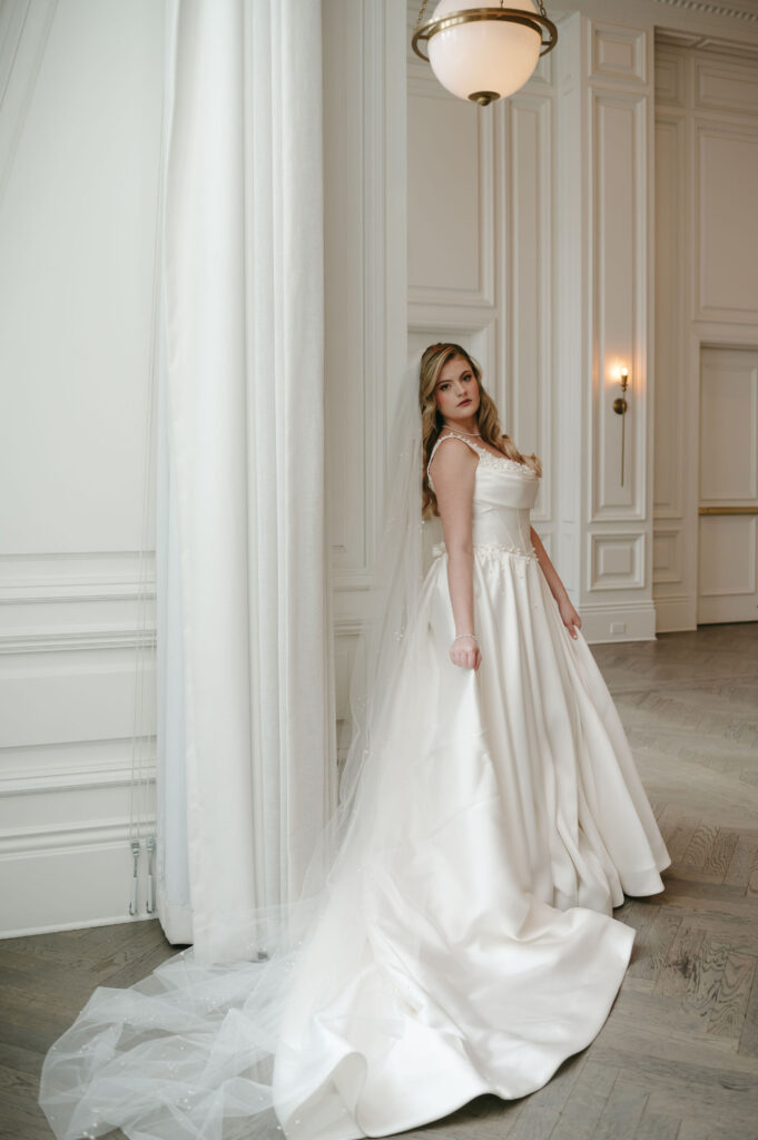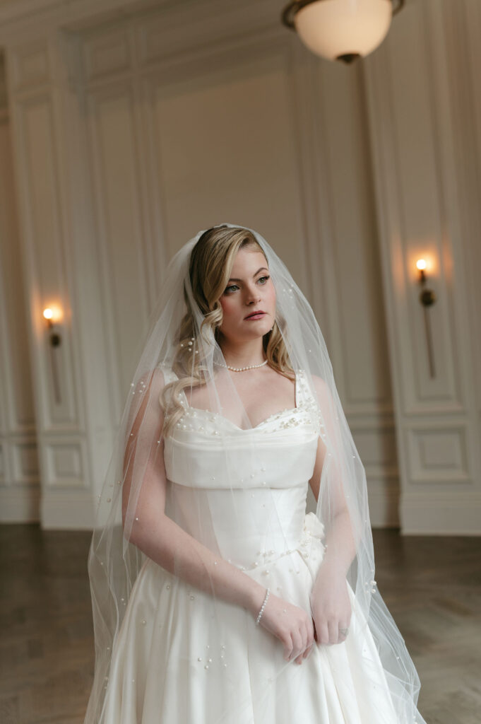 Winter light filled the hotel’s windows throughout the session. It wrapped each moment in a calm, romantic glow. The season’s quiet elegance complemented both the bride’s style and the historic setting.
