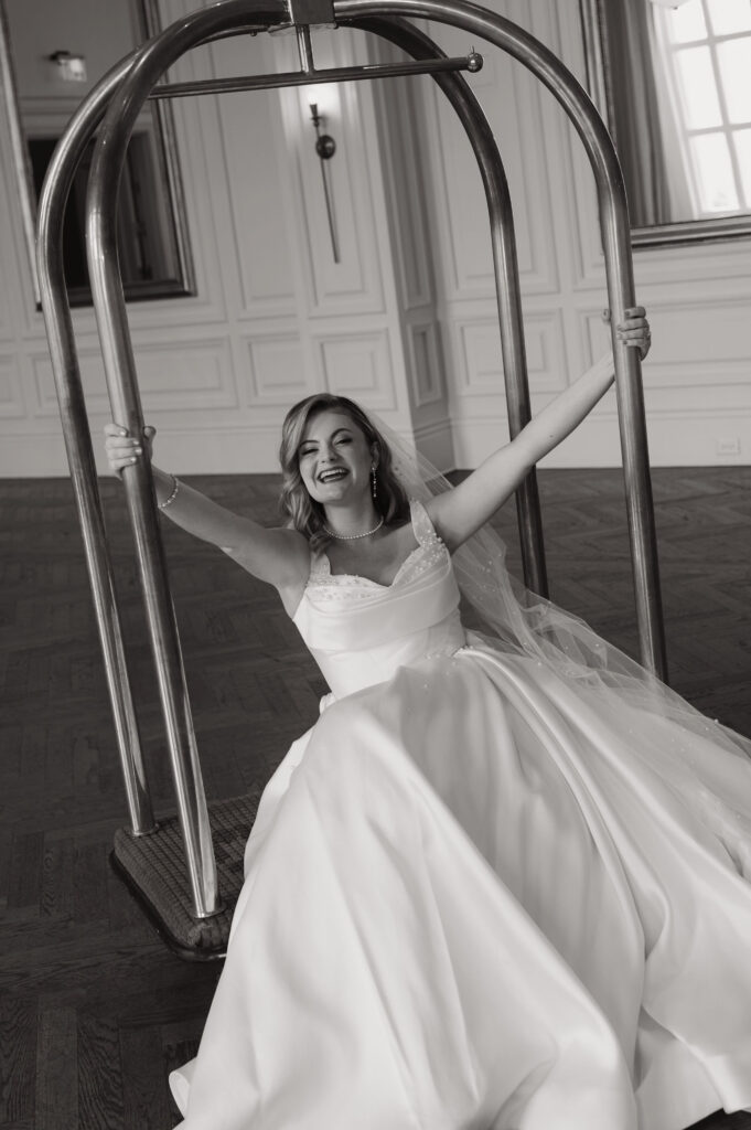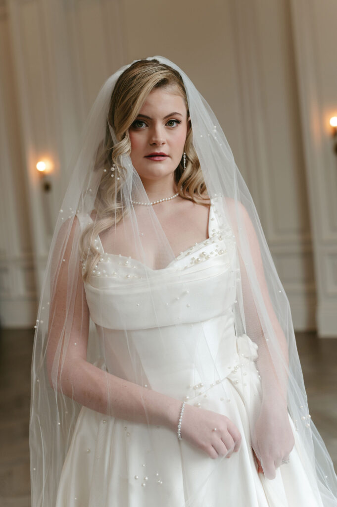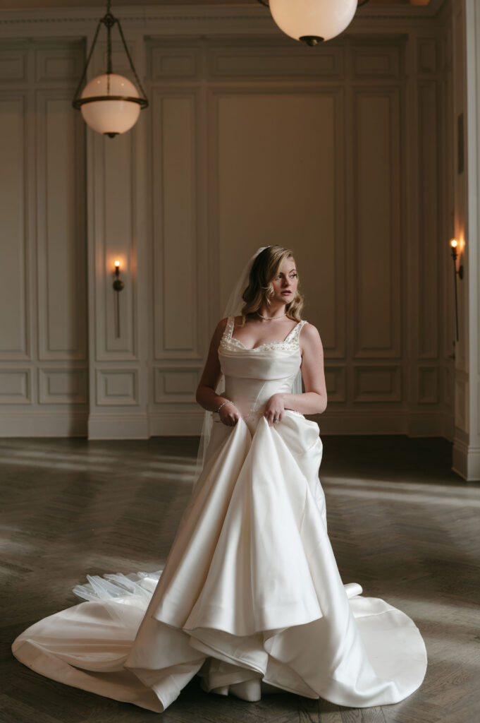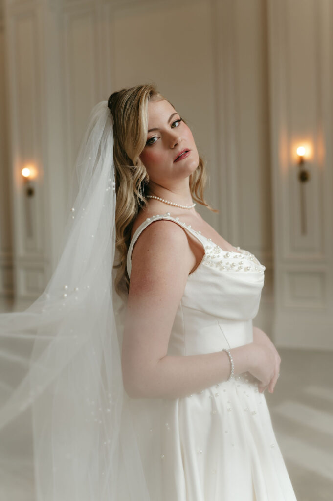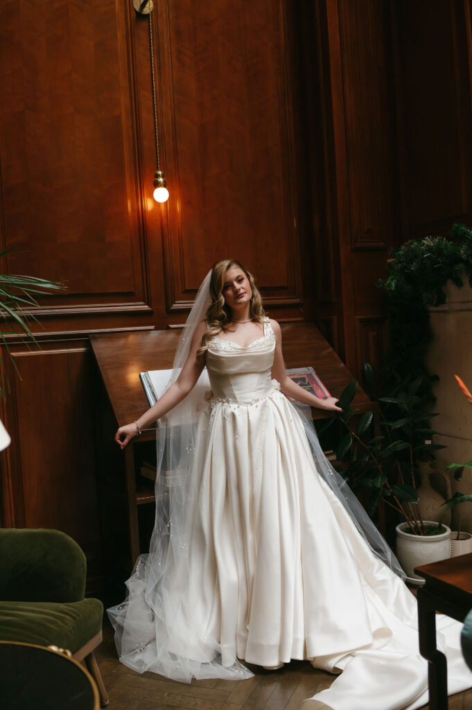 Winter light filled the hotel’s windows throughout the session. It wrapped each moment in a calm, romantic glow. The season’s quiet elegance complemented both the bride’s style and the historic setting.